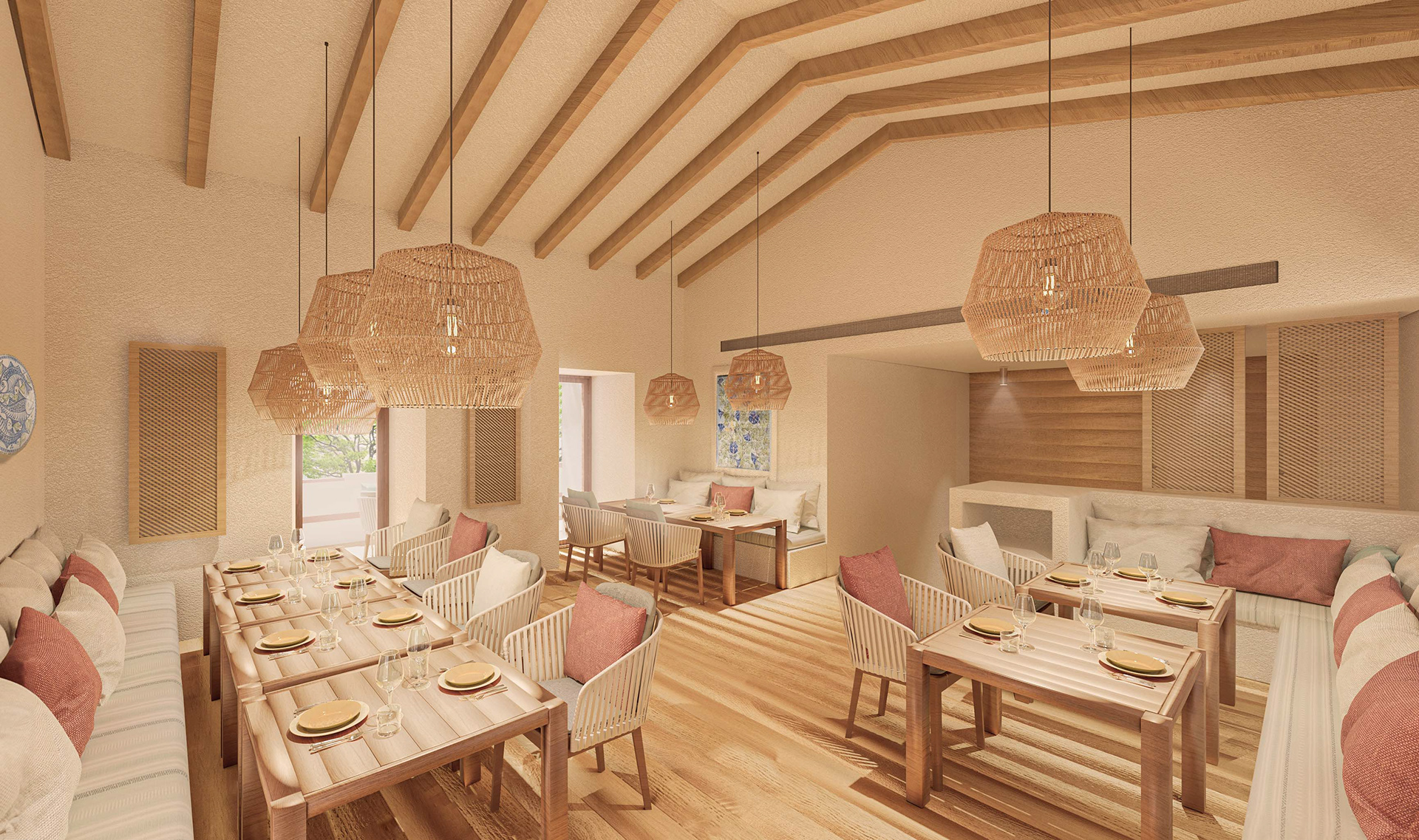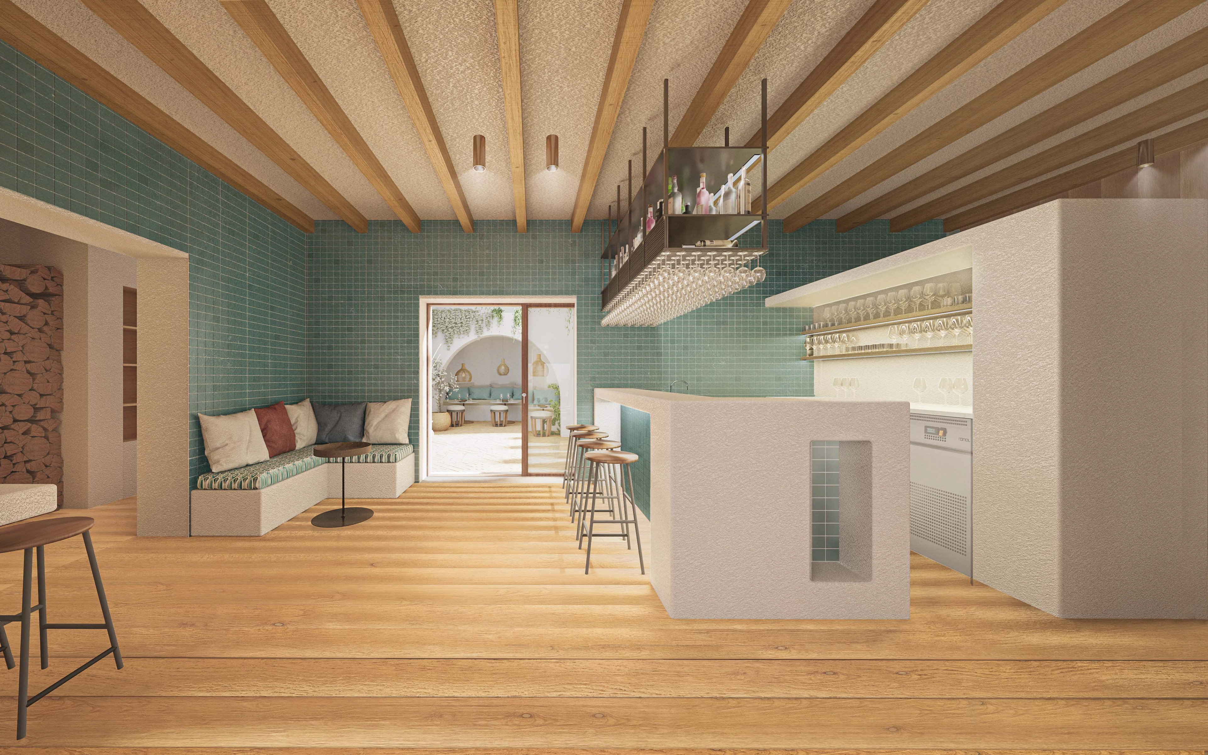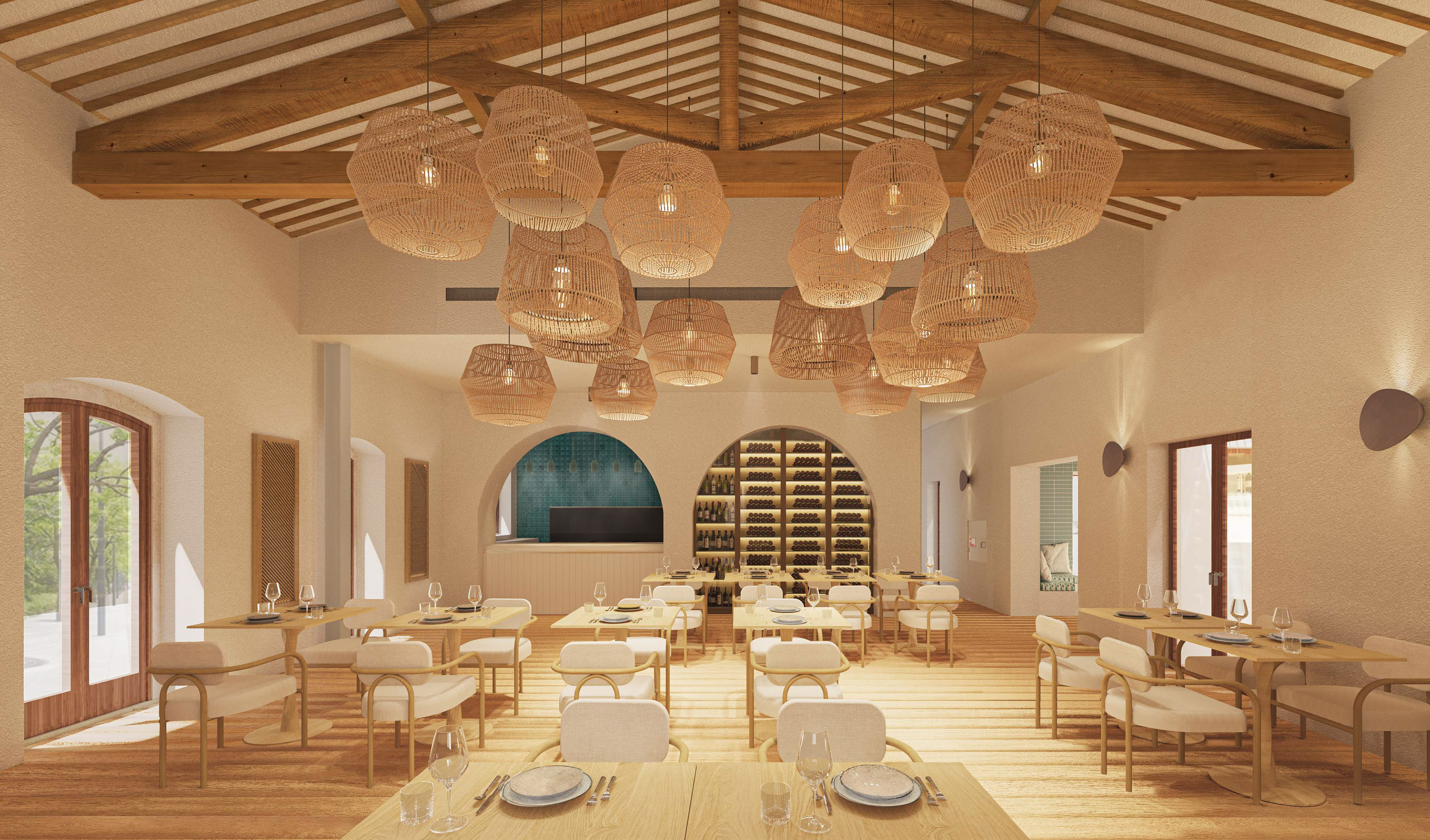 3D visualizations for an upcoming project, a fine dining restaurant located in the city of Guia, in Algarve. The existing building was extended and reinforced, creating a double height main dining area on the ground floor, and a series of patios and exterior shaded areas, perfect for dining in the local Algarve weather. The main material palette consisted of wood, rattan, tijoleira de Santa Catarina & stone. The bar, located on the ground floor, was covered in tiles, either working with a local provider (azulejaria de Porches) or with Viúva Lamego.