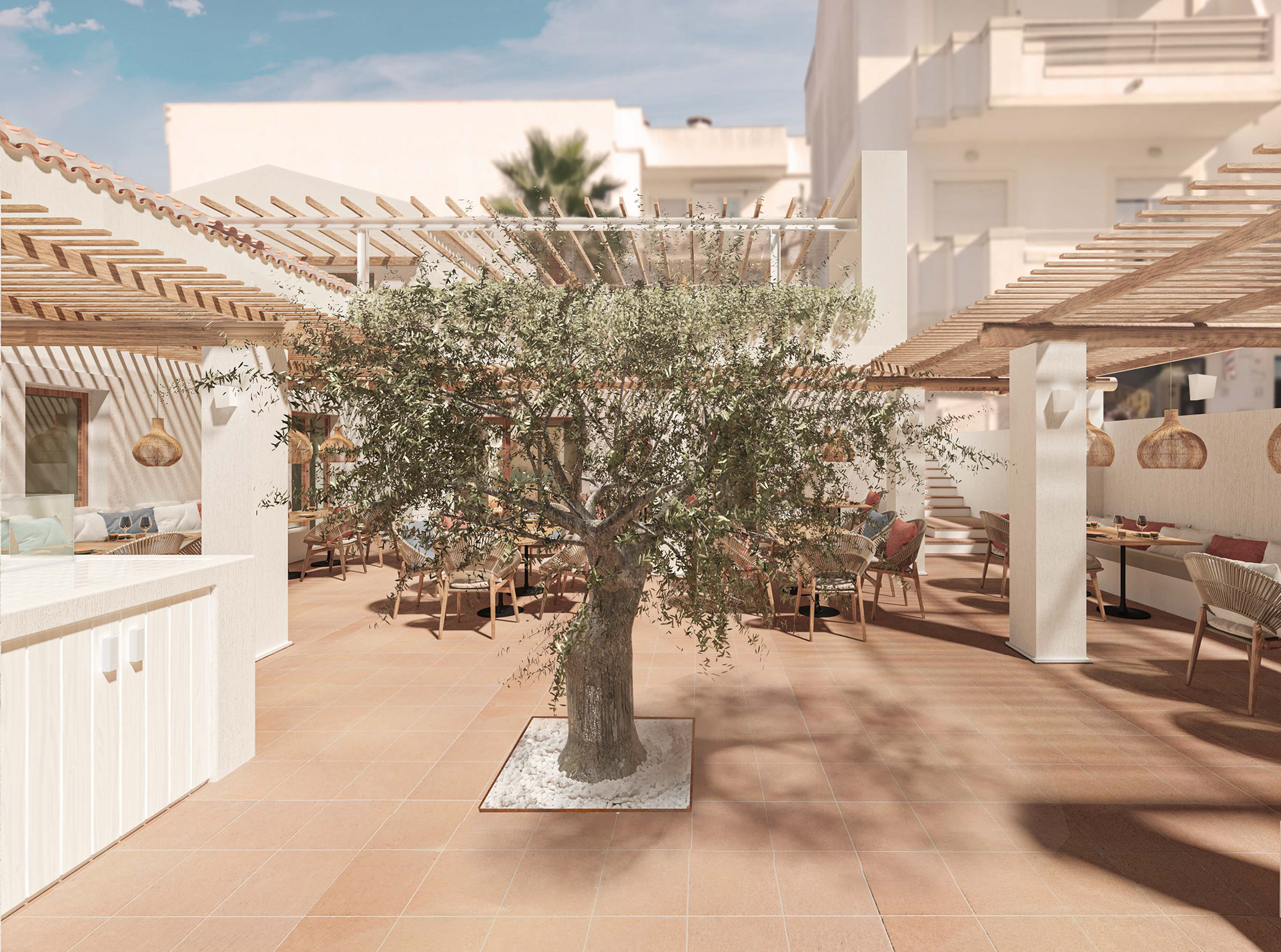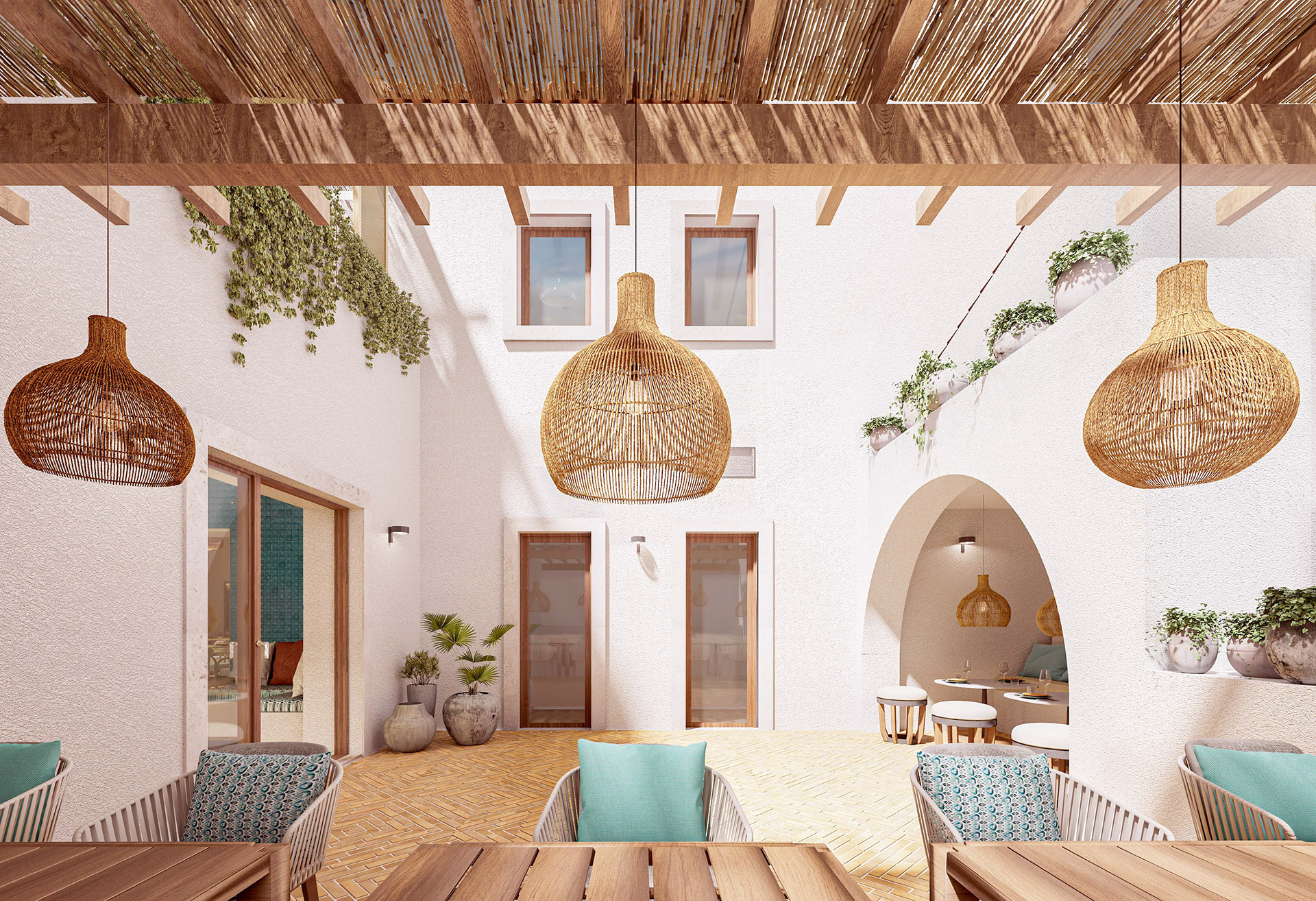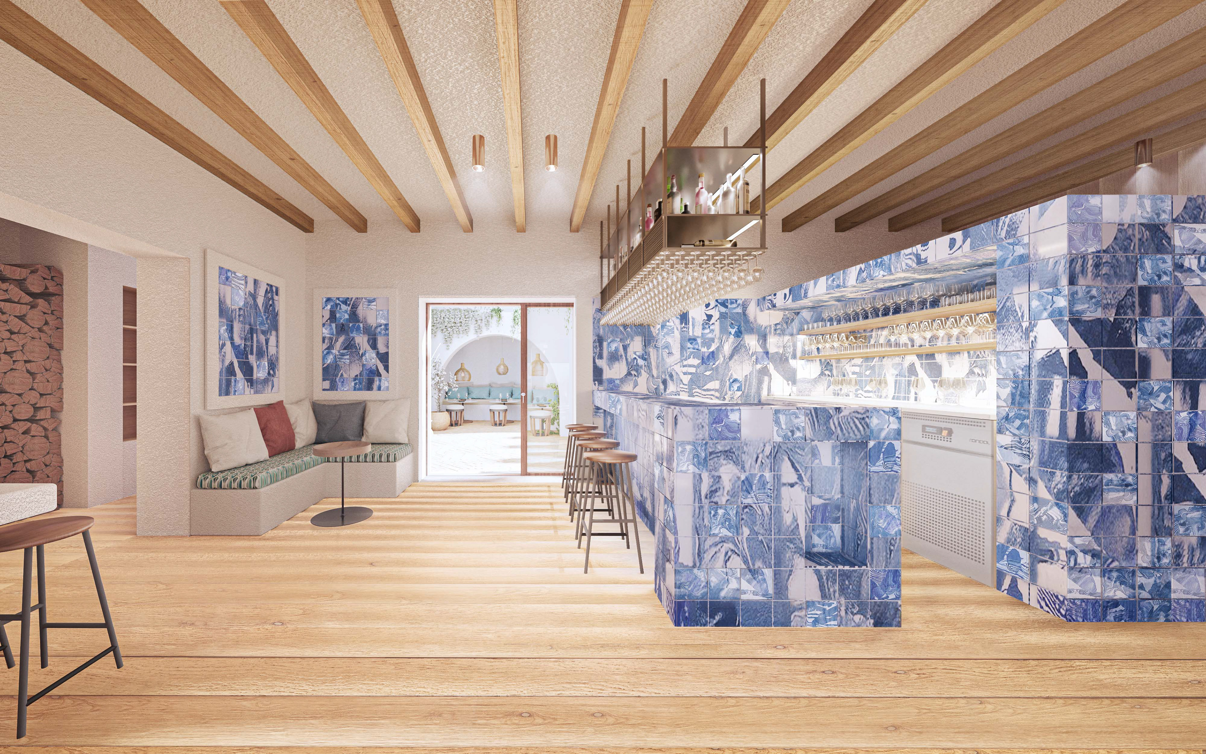 3D visualizations for an upcoming project, a fine dining restaurant located in the city of Guia, in Algarve. The existing building was extended and reinforced, creating a double height main dining area on the ground floor, and a series of patios and exterior shaded areas, perfect for dining in the local Algarve weather. The main material palette consisted of wood, rattan, tijoleira de Santa Catarina & stone. The bar, located on the ground floor, was covered in tiles, either working with a local provider (azulejaria de Porches) or with Viúva Lamego.