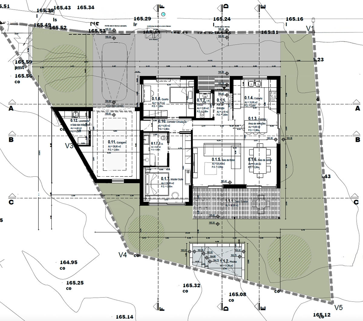 A clever and thoughtful approach was required, in order to take full advantage of the allowed buildable polygon and the reduced size of the plot, inserted into an urban area which has seen a lot of new buildings. The plot had an uneven shape and the loteamento rules only allowed to build following a diagonal line, which we refused and countered with a straightforward design, taking in generous sun and west light into the main living spaces (living room & kitchen) but also allowing the master bedroom to have a direct connection with the exterior.
