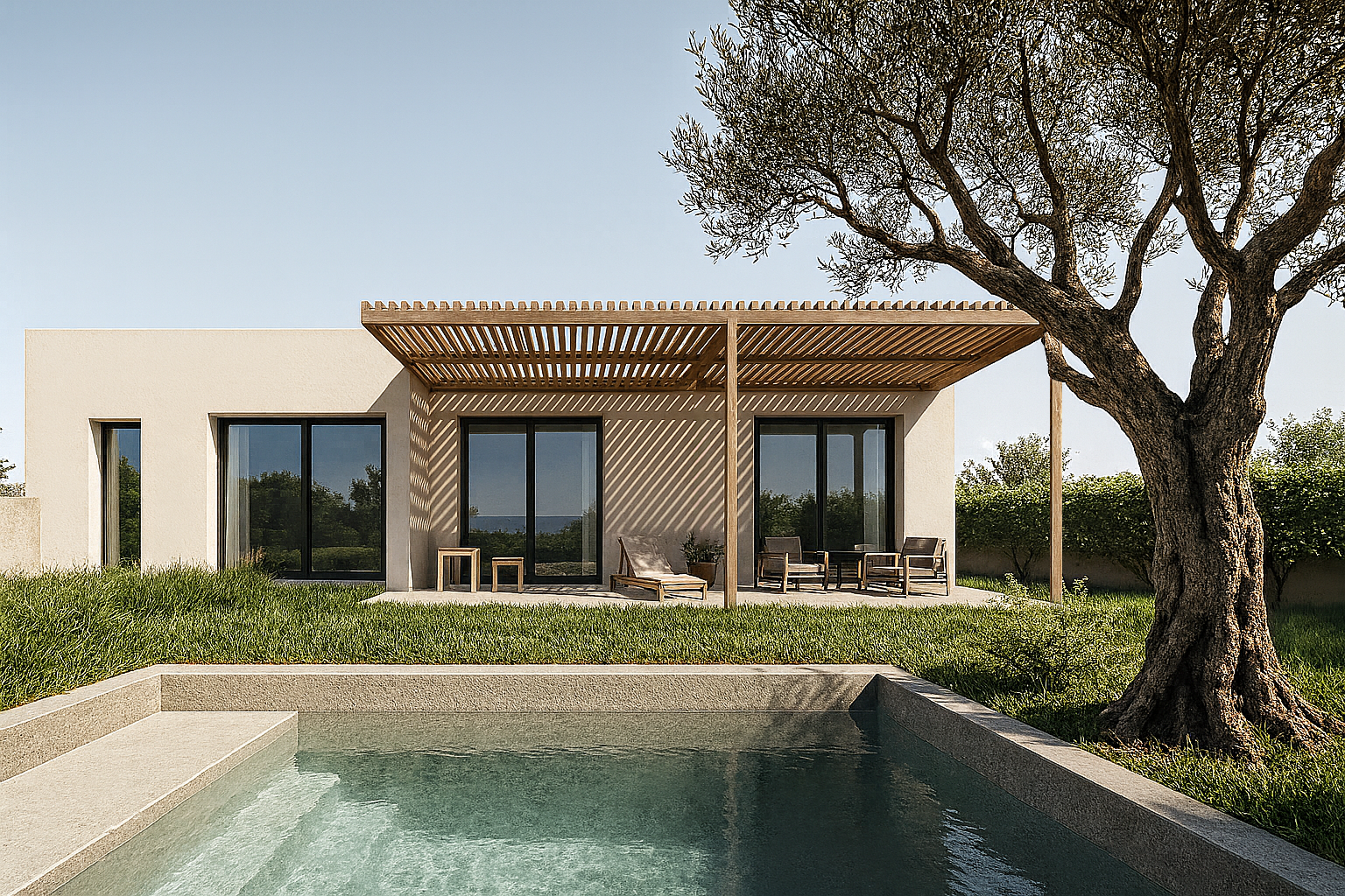 A large outdoor deck and living area, covered with a large wooden pergola, overlooks the swimming pool and backyard.