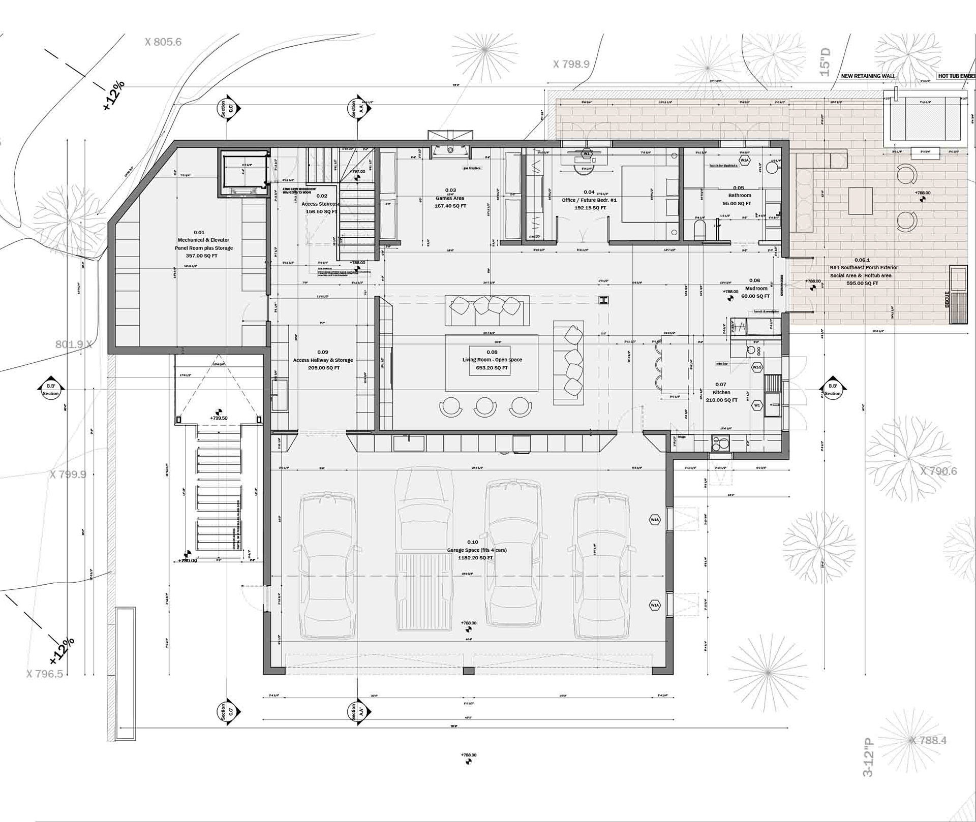 The house sits perched on the basement level, with two main levels for living and resting spaces.