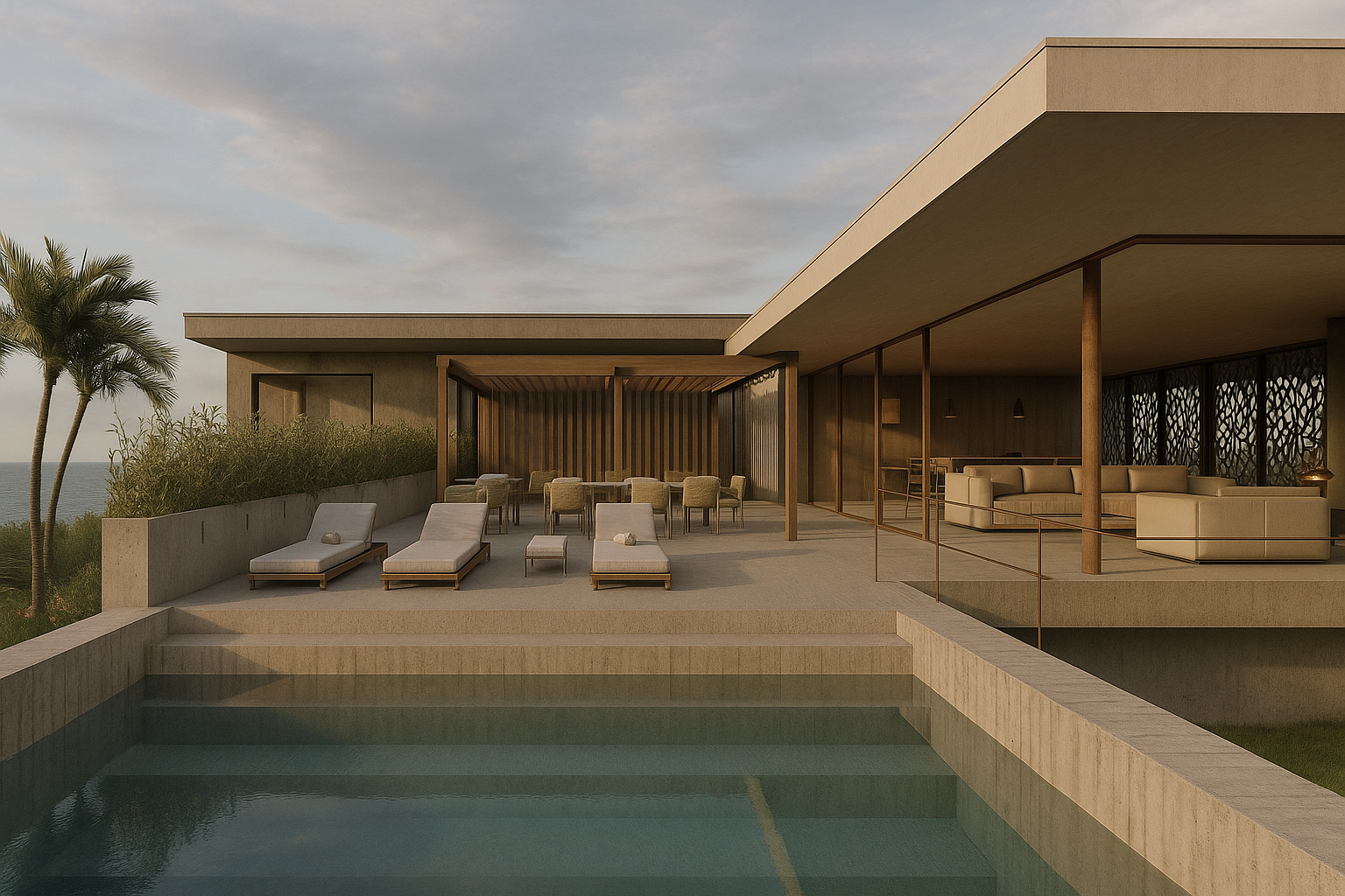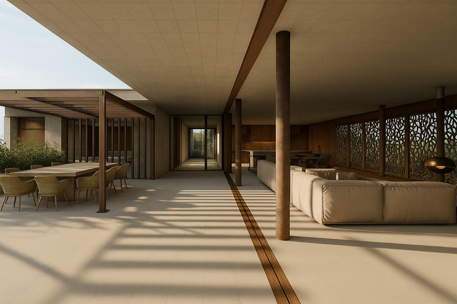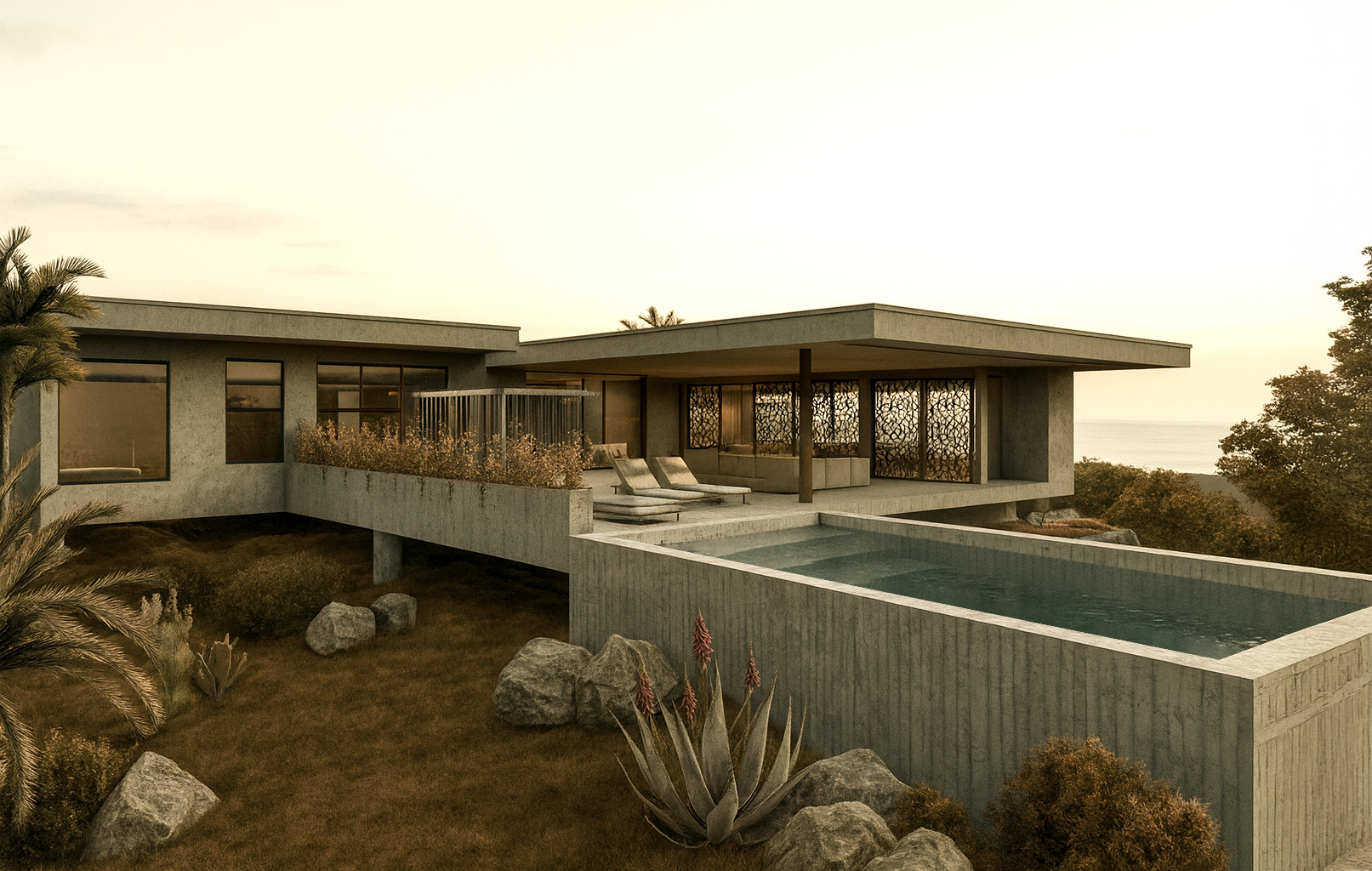 The main approach consisted of creating a volume that could sit on the site leaving the landscape relatively unscathed, and create a large living area with natural ventilation, connected to an interior semi-covered courtyard, which served as a transition from the living to the sleeping areas.